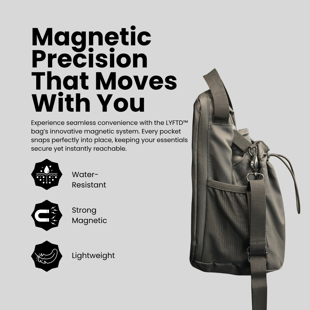 LYFTD™ isn’t just another gym bag, it’s a game-changer. With built-in high-strength magnets, it attaches securely to any metal surface (like gym lockers or weight racks), so your gear stays off the floor and exactly where you need it. It’s compact, water-resistant, and built specifically for movement, not just storage.